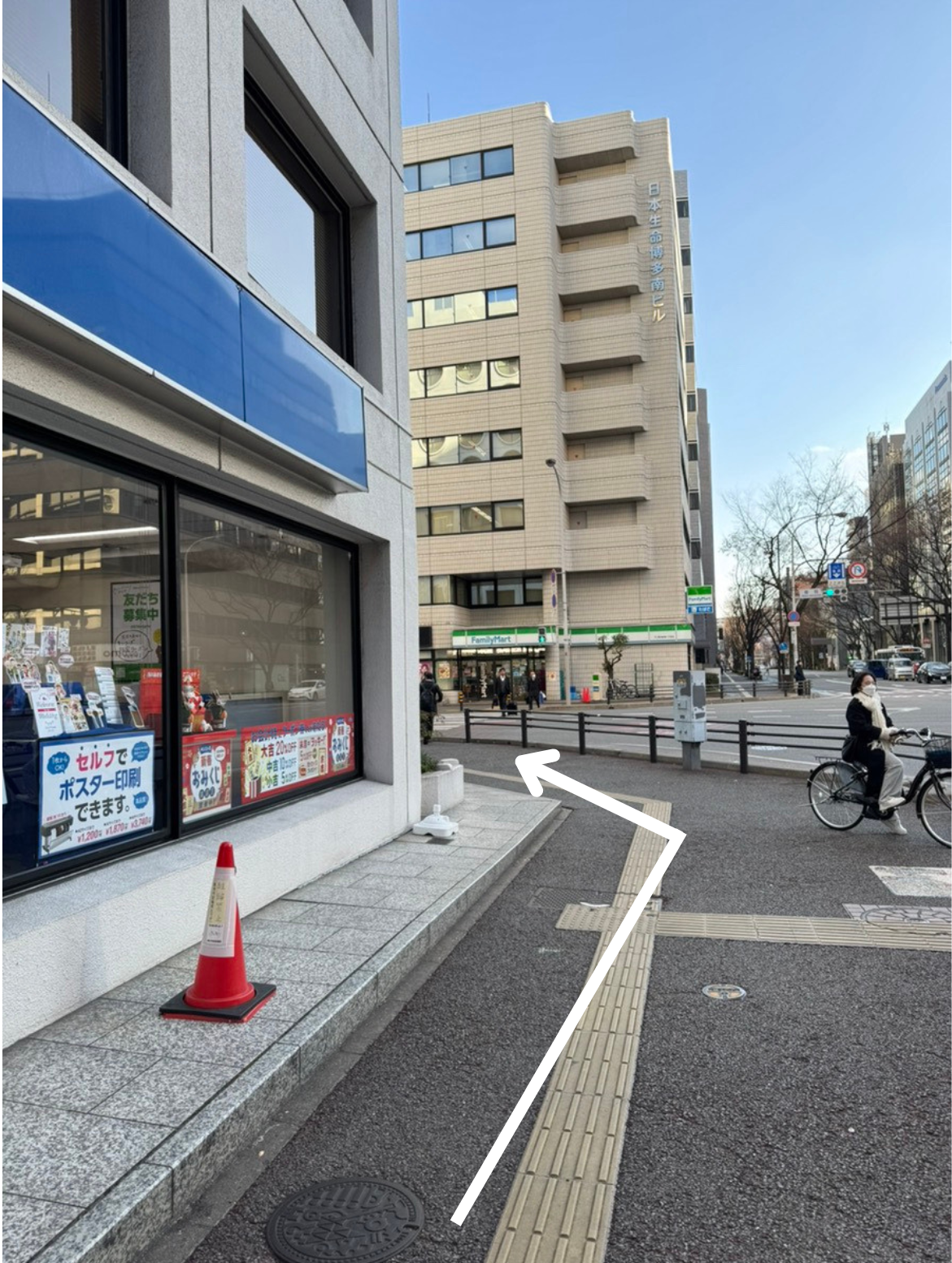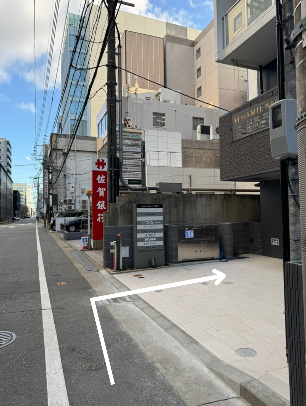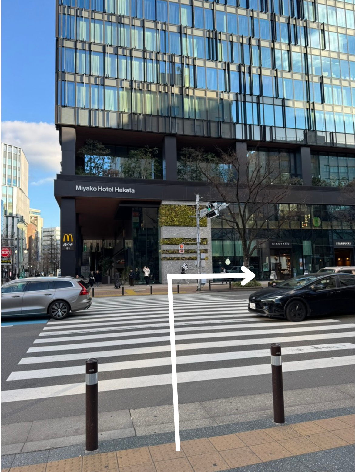 NSビルとSUIT SELECT博多の間の道路を右に曲がります。